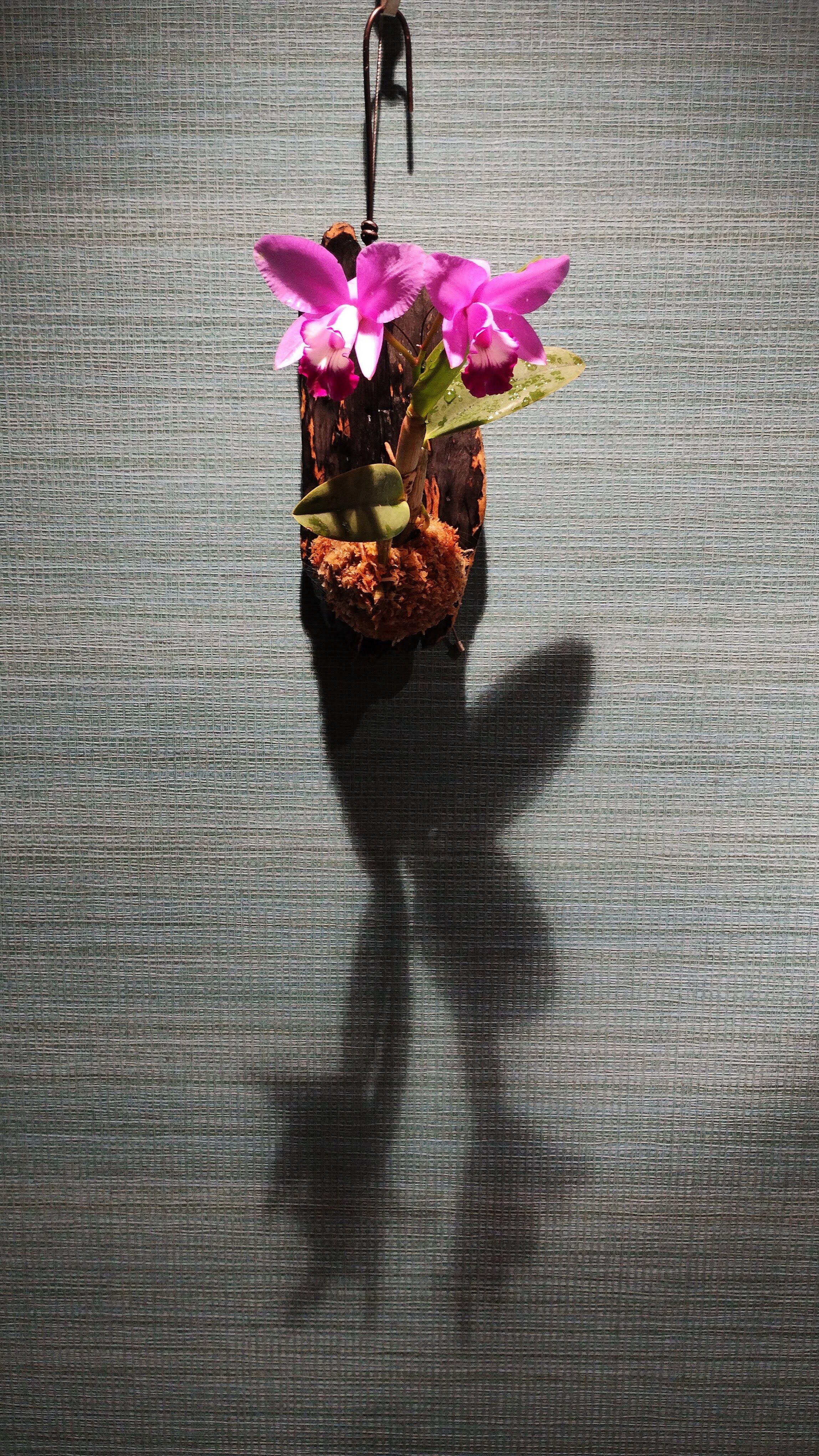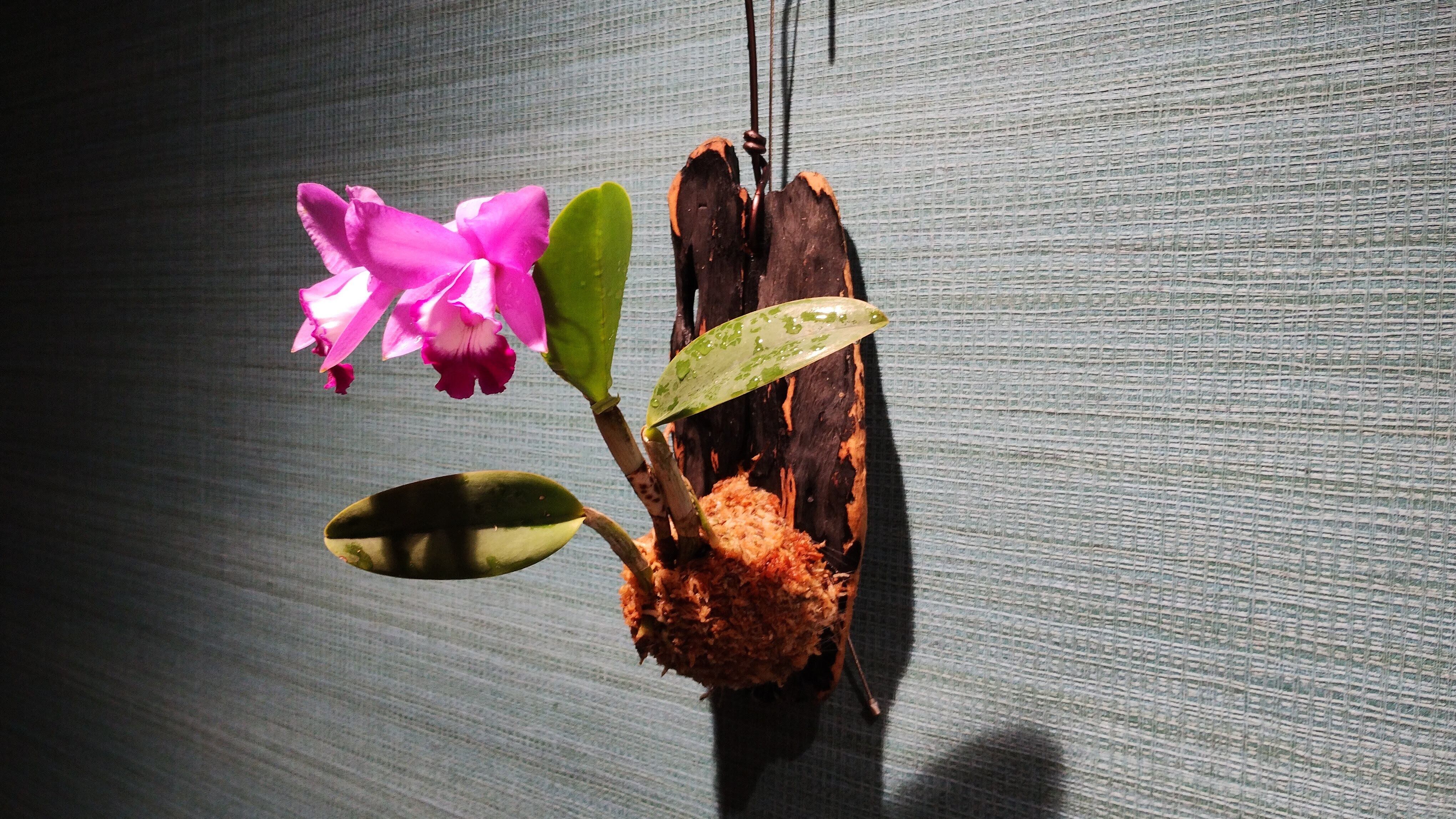 カトレアの花とその根元に寄り添う流木が見事に調和し、まるで森林の中にいるかのような癒やしの空間を演出します。