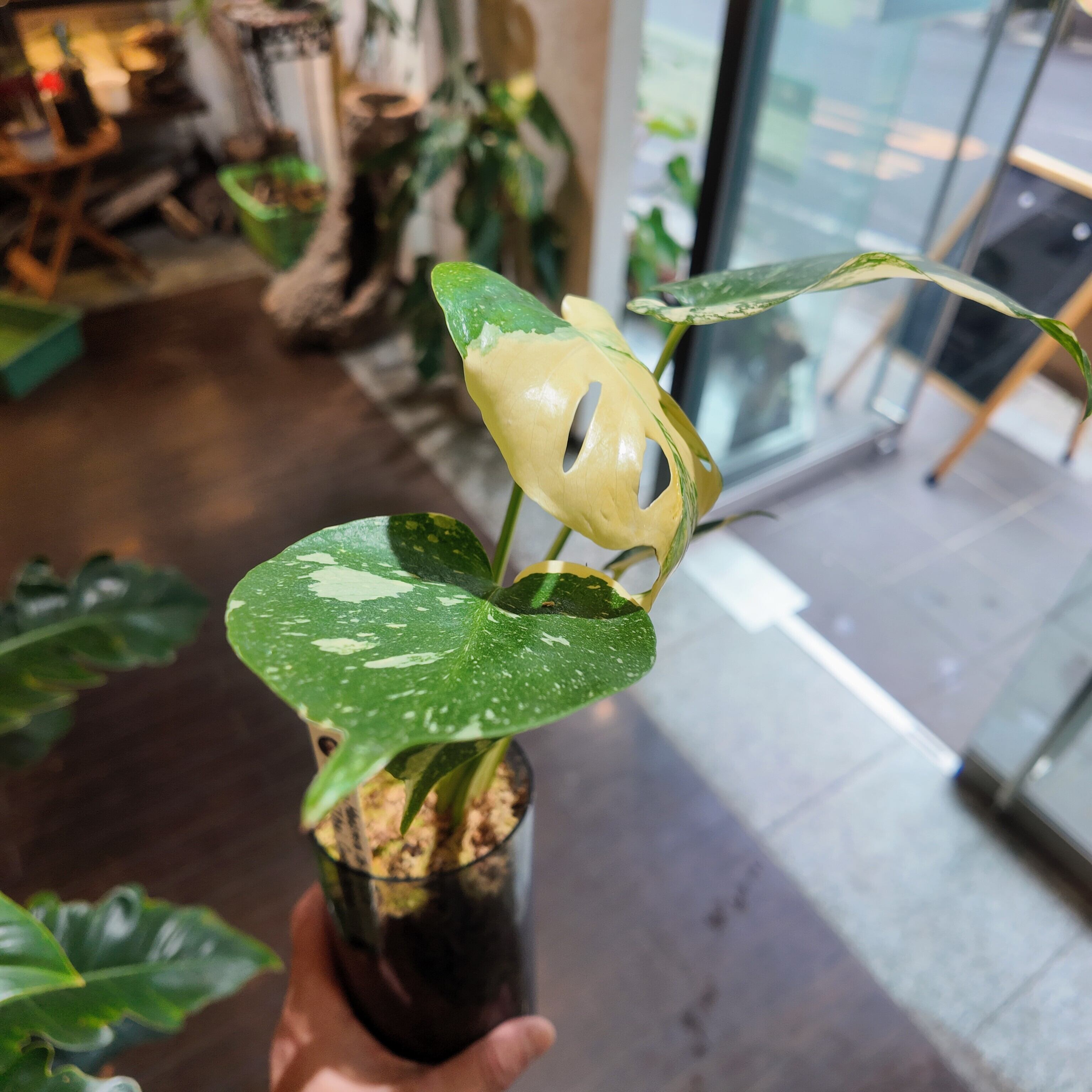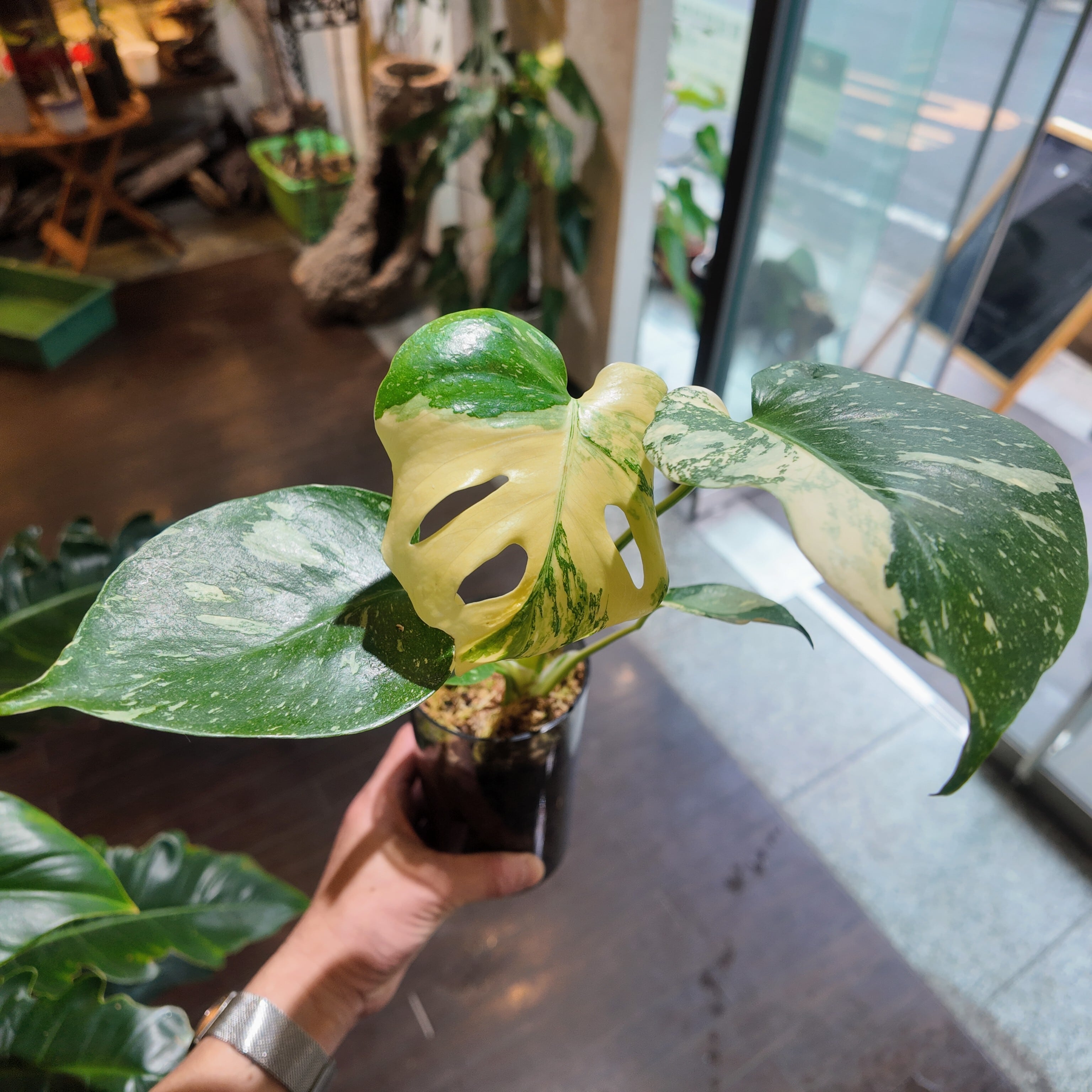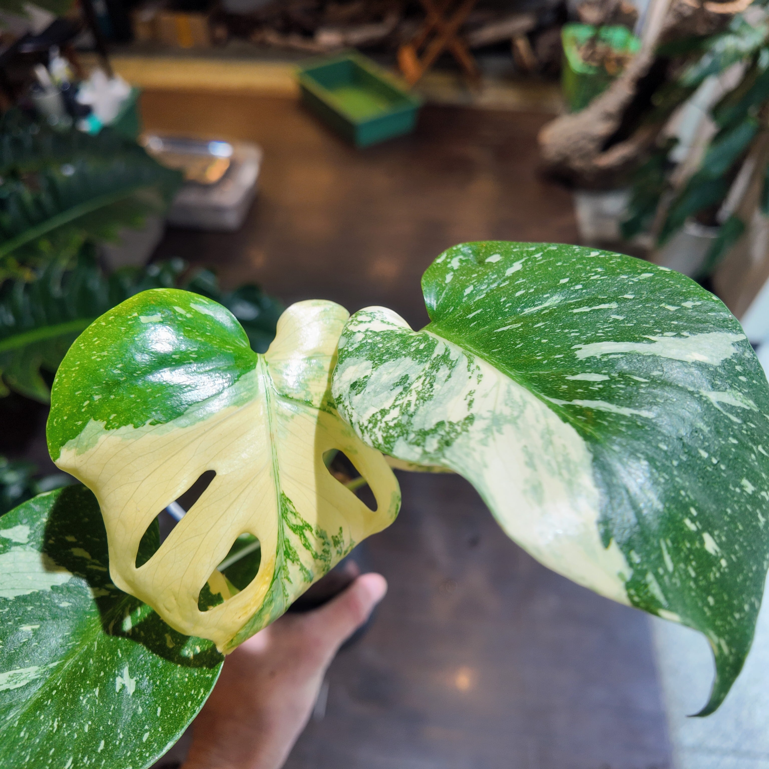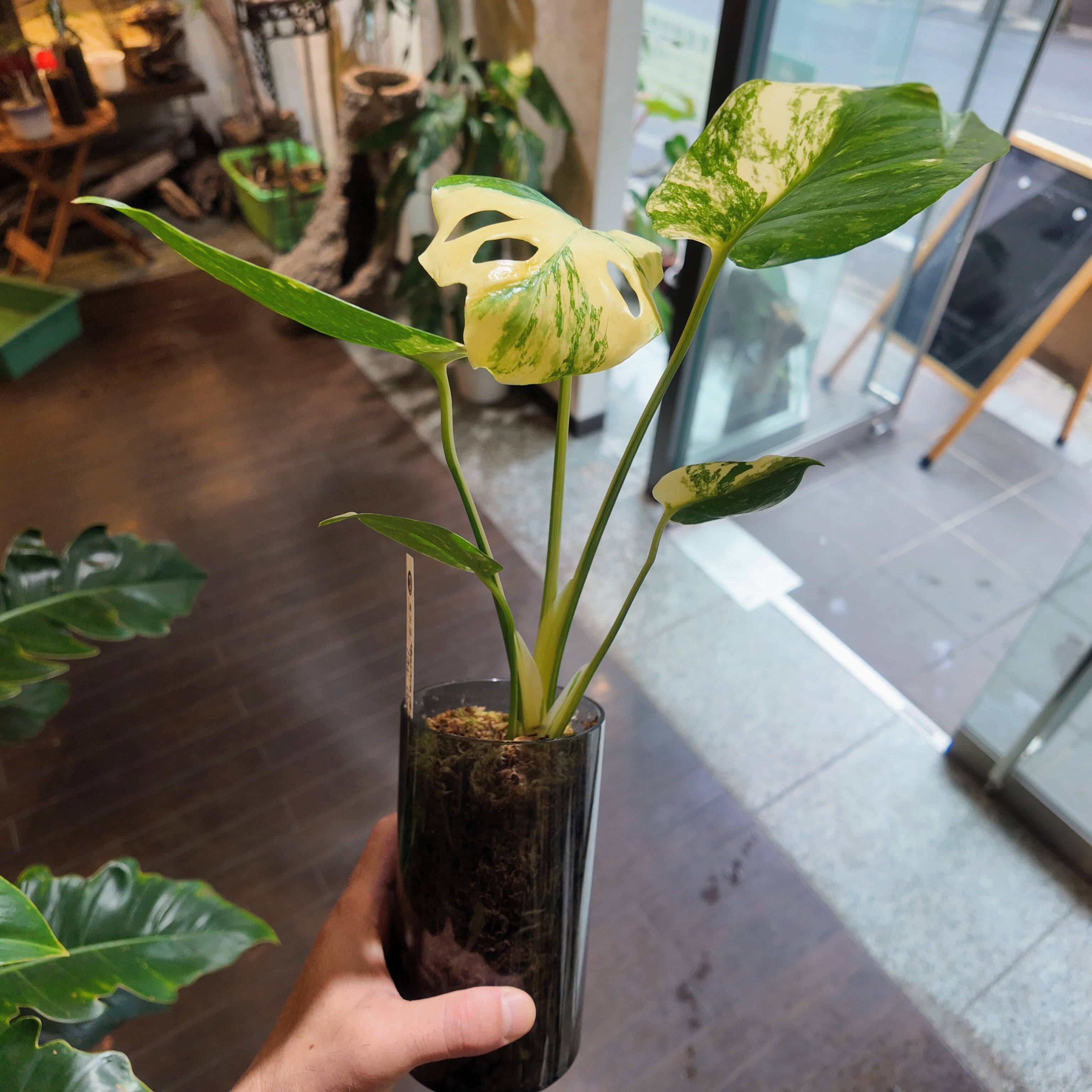 濃いグリーンにクリーム〜淡い黄色のマーブル模様が入る、星空のような斑が特徴の希少なモンステラ。